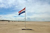 Ijmuiden The Netherlands Big skies and empty beaches on the Dutch North Sea Coast. A Dutch flag flies on the beach at Ijmuiden.