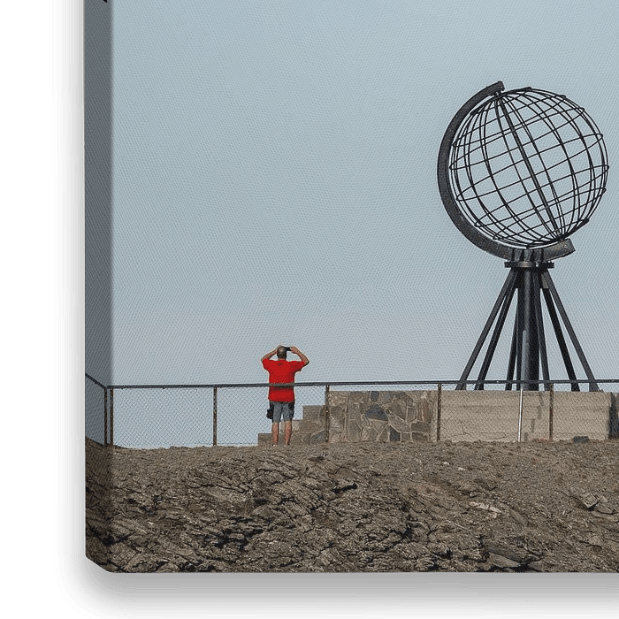 De globe, het monument op het noordelijkste punt van het vaste land van Europa. Een man maakt een foto van de globe. Het symbool van de Noordkaap staand op eind van het vaste land.