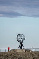 De globe, het monument op het noordelijkste punt van het vaste land van Europa. Een man maakt een foto van de globe. Het symbool van de Noordkaap staand op eind van het vaste land.