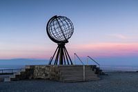 De globe, het monument van de Noordkaap tijdens een mooie zonsondergang.