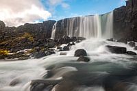 In het nationale park thingvellir in zuid IJsland vind je de Oxararfoss. Een kleine waterval die soms bij extreme weersomstandigheden enorm uit zijn voegen barst met een wilde waterstroom als gevolg.