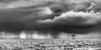 De Oerd, veerboot tussen Ameland en het vaste land, Friesland, met een onstuimig weerbeeld boven het Wad