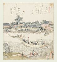 Een gezicht op de rivier de Sumida met veerboten en op de oever de huizen van de hoofdstad Edo. In de lucht een vlieger. Op de voorgrond reizigers te voet en te paard in de richting van een brug. Met twee gedichten. Middenblad van een triptiek.