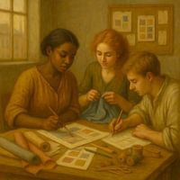 Een groep werkt met stofstalen, schetsen en gereedschap op tafel. Ze vergelijken kleuren, testen materialen en vormen ideeën met zichtbare aandacht. Dit werk laat het begin van het maakproces zien, waar verbeelding en structuur samenkomen. De Ontwerpers is een ode aan visueel denken, gedeelde creativiteit en de stille concentratie…