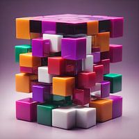 Dit werk verkent de visuele spanning tussen structuur en chaos. De afzonderlijke blokken, onberispelijk in hun vorm, zijn willekeurig gestapeld, waardoor een onvoltooide kubus ontstaat die zowel onvolmaaktheid als potentie symboliseert. De levendige kleuren benadrukken individuele elementen en creëren een gevoel van diepte en beweging. De glanzende oppervlaktes reflecteren licht en versterken het gevoel van ruimtelijkheid.