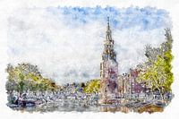 Digitaal aquarel van de toren van de Oude Kerk in Amsterdam.