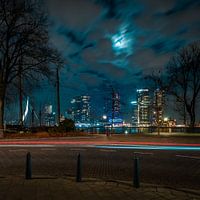 Een auto rijd voorbij en laat een lichtspoor achter. Ik wil oversteken, naar de overkant. Niet van de straat maar van de Maas. een nieuwe stad lokt mij met haar lichtjes. Kom naar de overkant...