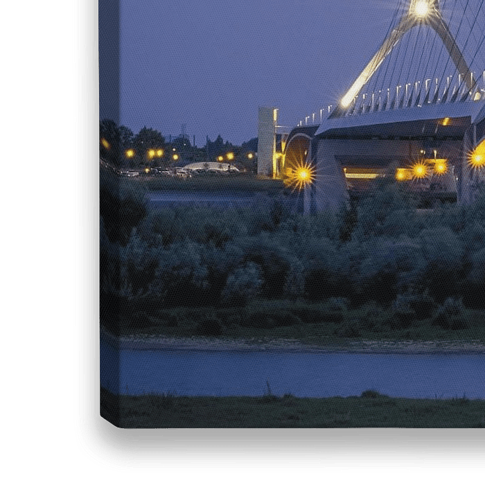 Een avond tijdens zonsondergang bij de Oversteek, ook wel Stadsbrug genoemd, een brug voor het autoverkeer over de Waal, te Nijmegen. De weg over de brug draagt sinds 2016 de naam Generaal James Gavinsingel.