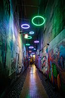 Deze foto legt een levendige steeg in de stad 's nachts vast, aan beide kanten versierd met kleurrijke graffiti. De muren zijn beschilderd in verschillende tinten groen, blauw en paars, met ingewikkelde, abstracte ontwerpen en tags. Neongroene en -blauwe ringen hangen aan het plafond en werpen een gloeiend licht. Het geplaveide pad loopt door het midden en leidt naar een schemerige uitgang aan het einde. Het steegje is smal en de mix van texturen en kleuren creëert een levendige, gedurfde sfeer.
