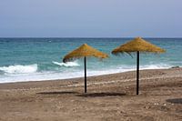 Twee natuurlijke parasols op een verlaten Spaans strand in Cabo de Gata.