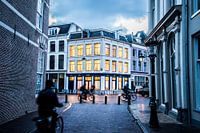 Een ochtendfoto genomen vanaf Achter de Dom richting de Pausdam in de historische binnenstad van Utrecht. De fietsers en het licht het gebouw zorgen voor een mooi effect.