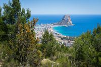 Uitzicht vanaf de Sierra de Oltà richting Calpe. Het toeristische kustplaatsje Calpe en zijn bezienswaardigheid, de rots genaamd Peñón de Ifach, zijn zichtbaar achter de boomtoppen van dennen en struiken. De stedelijke architectuur en de kustlijn lijken vrij helder in het mediterrane zonlicht. De stad aan de Middellandse Zee is omgeven door ongerepte natuur. Het groen van de pijnbomen ontmoet het betoverende blauw van het zeewater.
