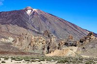Landschapsfoto van Pico Del Teide op Tenerife met op de voorgrond vulkanische rotsformaties en schaarse vegetatie. Genomen in november 2014.