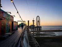 Een prachtige zomerse zonsondergang op De Pier in Scheveningen, waar de zon tussen de pijlers door langzaam in de zee wegzakt.