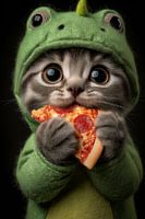 Ontmoet de schattigste "Pizza-saurus" ooit! Gekleed in een gezellige groene dinosaurus onesie is dit kleine katje maar op één ding gefocust: een heerlijk stuk peperoni pizza. Die grote, zieltogende ogen maken het onmogelijk om nee te zeggen tegen een tweede korst. Maximaal comfort.