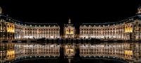 De Place de la Bourse gezien vanaf de boulevard met de beroemde spiegelende fontein bij nacht
