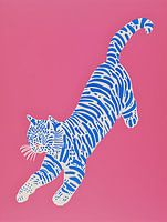 In dit kunstwerk wordt een blauwe poes tot leven gebracht in een mix van heldere kleuren en tinten, die prachtig samensmelten en een levendige sfeer oproepen.