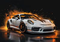 De Porsche 911 GT3 RS in wit met zwarte strepen en vlammenspetters, trekt de aandacht tegen een donkere achtergrond, waarbij de gestroomlijnde carrosserie van de grond weerkaatst voor een dramatische showcase. Hij wordt aangedreven door een 4.0L atmosferische flat-six die 518 pk produceert en beschikt over agressieve aerodynamica, een enorme achtervleugel en op het circuit afgestemde precisie. Het contrast van wit en zwart accentueert zijn raceontwerp, waardoor het een echt prestatie-icoon is dat in de schijnwerpers staat.