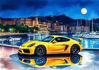 Een gele Porsche Cayman GT4 schittert in het maanlicht bij een Europese haven aan zee. Zijn levendige lak steekt af tegen het donkere, kalme water en de verweerde stenen paden. Reflecties van de oceaan glinsteren over zijn gestroomlijnde carrosserie, terwijl nabijgelegen boten zachtjes deinen in de haven. De nachtlucht draagt een stille energie met zich mee terwijl de GT4 rust als een opgerolde veer - helder, brutaal en klaar om over de kustwegen te brullen wanneer je maar wilt. Het is een baken van snelheid temidden van tijdloze sereniteit.