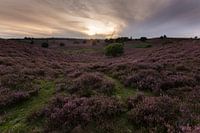 De heide staat in bloei en kleurt prachtig paars door het warme licht van de zonsondergang. De Posbank bij de Veluwe op z'n best