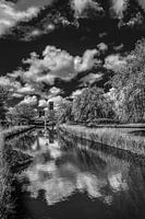 Het riviertje De Potmarge in Leeuwarden stroomt dwars door de stad en biedt soms fraaie uitzichten op de skyline van de Friese hoofdstad. Foto in zwart-wit