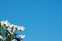 Een bosje madeliefjes links onder met veel blauwe lucht. Het is een mooie dag waardoor de madeliefjes de kans krijgen om de zon te vinden.