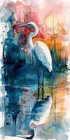 Dit rustgevende, vredige aquarelkunstwerk toont een elegante reiger, statig poserend tegen een achtergrond van warme ochtendgloren.
