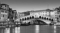 Een horizontale Zwart-Wit foto met uitzicht over het Canal Grande in Venetië richting de beroemde Rialto brug op een mooie avond na zonsondergang tijdens het blauwe uur.