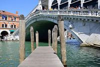 De Rialtobrug gezien vanaf een korte promenade in het Canal Grande in de stad Venetië, Italië. Een typische plek om foto's te maken en we zagen hier zelfs een bruidspaar hun trouwfoto's maken.