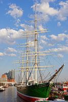 Het oude vrachtschip uit 1896 doet vandaag de dag dienst als museumschip bij de St.-Pauli landingsbruggen en is een mijlpaal van Hamburg. Hamburg, Duitsland, Duitsland, Noord-Duitsland. Opgenomen in augustus 2018.