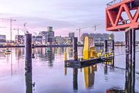 De Rijnhaven in Rotterdam op een koude maar fraaie ochtend in januari, net voor zonsopkomst. Rechts een stukje van het Nieuwe Luxortheater, in het water een gele aanlegsteiger, op de achtergrond Katendrecht met de graansilo en de Fenixlofts.