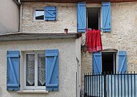 In het mooie Franse plaatsje Chablis, Bourgondie stond dit huis in een smal straatje. De frisse kleuren van het huis, wit, en de blauwe luiken tesamen met de fleurige rode deken uit het raam vroegen er gewoon om om gefotografeerd te worden.