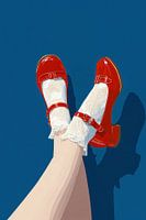 Een stijlvolle illustratie van klassieke rode Mary Jane schoenen met kleine hakjes, gedragen met delicate witte kanten sokjes tegen een diepblauwe achtergrond. De benen zijn speels gekruist en creëren een nostalgische, vintage sfeer die doet denken aan de mode uit de jaren '50. Het glanzende rode lak van de schoenen contrasteert prachtig met de zachte, romantische kanten details.