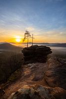 De Rötzenfels, een landschapsopname van een zandsteenrots met een kruis en een boom, zonsopgang met van Fotos by Jan Wehnert