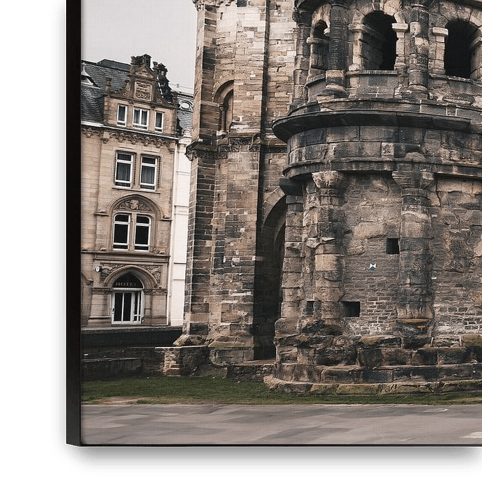 Deze foto toont de imposante Porta Nigra, het bekendste bouwwerk van Trier en een van de best bewaarde Romeinse stadspoorten ten noorden van de Alpen. Gefotografeerd recht van voren, laat het beeld de symmetrie en gelaagdheid van de poort goed tot zijn recht komen. De donkere, verweerde zandsteen waaruit het monument is opgebouwd,…