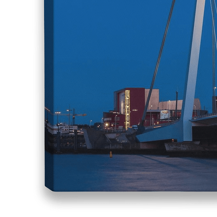 De Rotterdam van rem Koolhaas in het blauwe uurtje net na zonsondergang met de erasmusbrug op de voorgrond.