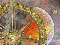 Digitaal schilderij van een futuristische constructie: een ruimtelift. Het is een geweldige technologische uitdaging om een liftinstallatie te bouwen die mensen en goederen kan vervoeren van het oppervlak van een planeet naar een station op de drempel van de interplanetaire ruimte. Maar als het lukt heb je een economische en duurzame manier om het zonnestelsel te bereizen. We zien hier een ruimtelift vanaf de vulkaan Pavonis Mons op de evenaar van Mars, zoals beschreven in de boeken van Kim Stanley Robinson.