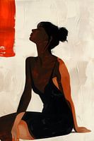 De vrouw zit in een ontspannen houding en kantelt haar hoofd licht naar achteren, alsof ze zich laat koesteren door een onzichtbare zon of geniet van een innerlijk moment van rust. Haar zwarte jurk benadrukt de elegantie van haar…