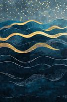 In dit werk rollen diepe, blauwzwarte golven door een nachtelijke zee, onder een hemel vol sterren die oplichten als zachte lichtpuntjes. De gouden lijnen bewegen als een dans van licht op het water, subtiel en hypnotiserend. De eenvoud van het tafereel nodigt je uit om te verdwalen in de golven en je gedachten mee te laten voeren naar een plek waar de tijd even stil lijkt te staan. Het is de verstilling van de nacht gevangen in lijnen en kleur, een moment dat blijft hangen in de ruimte tussen droom en werkelijkheid.