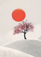 Een indrukwekkende conceptuele illustratie toont een eenzame sakuraboom die prominent oprijst op een witte heuvel, afgezet tegen een stralende rode zon die door een witte lucht priemt. Het minimalistische ontwerp accentueert de elegantie van de boom en het levendige contrast tussen de witte heuvel en lucht. De rode zon baadt het landschap in een warm licht en benadrukt de fragiele schoonheid van de sakuraboom.