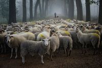 Op een mistige zondagmorgen had ik het geluk van tijdens een wandeling van deze schaapherder tegen te komen met zijn kudde. De schaapherder op de achtergrond is er achteraf aan toegevoegd.
