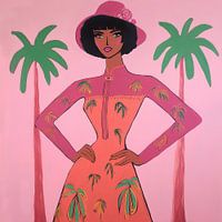 In dit schilderij staat een vrouw met een strohoed, die de aandacht trekt en tegelijkertijd een aura van mysterie creëert. Ze bevindt zich in een serene, dromerige omgeving met een zachte lichtroze achtergrond die een gevoel van rust en verwondering oproept. Haar oranje jurk, rijk aan kleur en levendigheid, heeft roze mouwen die de speelsheid van haar outfit onderstrepen. Over de jurk zijn subtiele, maar gedetailleerde afbeeldingen van palmbomen gestikt — een tropisch motief dat haar aanwezigheid naar een zonnige, exotische wereld lijkt te transporteren.