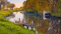Een 16:9 foto van een voorjaarsochtend na zonsopkomst langs de Scharmer Ae, een kanaal nabij het pittoreske Woudbloem, een dorpje dat diepgeworteld is in de geschiedenis van de gemeente Midden-Groningen.