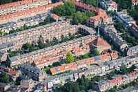 De Schildersbuurt, met Wilhelminakerk, aan de Paulus Potterstraat / Hobbemastraat in Utrecht. Verder lopen op de foto van links naar recht duidelijke de Jan van Scorelstraat en de Jacob van Ruijsdaelstraat. Rechts in de foto is de Frans Halsstraat te onderscheiden.