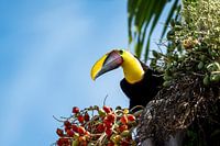 Deze foto toont de magie van de natuur in zijn meest levendige vorm, met een prachtige toekan gehuld in schitterend geel. Zijn veren lijken wel doordrenkt met zonlicht, waardoor de foto een stralende, kleurrijke uitstraling heeft. De foto vangt het exotische karakter van Costa Rica's wildlife en brengt het naar voren als een levend kunstwerk.