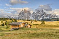 Uitzicht over de alpenweiden en hutten van de Alpe di Siusi in Zuid-Tirol naar de besneeuwde bergen Sassolungo en Sassopiatto. De zon baadt het landschap in een warm licht.