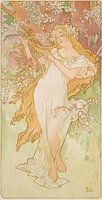 The Seasons 2, Alphonse Mucha (1896) Alfons Maria Mucha, internationaal bekend als Alphonse Mucha, was een Tsjechische schilder, illustrator en graficus die in Parijs woonde tijdens de Art Nouveau periode. Hij is vooral bekend om zijn uitgesproken gestileerde en decoratieve theateraffiches, met name die van Sarah Bernhardt. Hij maakte illustraties, advertenties, decoratieve panelen en ontwerpen, die tot de bekendste afbeeldingen van die periode behoorden.