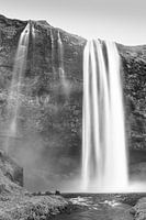 Zwart-wit foto van de bekende Seljalandsfoss waterval in het zuiden van IJsland. De Seljalandsfoss is een van de bekendste watervallen van IJsland die op vele foto's en kalenders wordt afgebeeld. Deze 65 meter hoge waterval in het zuiden van IJsland ligt vlak aan de ringweg. Bovendien ligt hij aan de route naar Þórsmörk, én is het mogelijk om op een glibberig pad achter de waterval langs te lopen. Net als de 15 kilometer verderop liggende Skógafoss stroomt de Seljalandsfoss over wat eens de kliffen van de voormalige IJslandse kustlijn waren. In de directe omgeving van de Seljalandsfoss liggen nog een paar watervallen, waarvan de Gljúfrafoss vaak als de mooiste wordt gezien omdat die in een half verscholen kloof valt. Niet te verwarren met de Gljúfursárfoss (kloofrivierwaterval) die te vinden is in het oosten van IJsland.