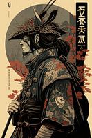 De afbeelding toont een samoerai in vol ornaat, staande met zijn zwaard klaar voor de strijd. De samoerai heeft zijn harnas aangetrokken. Zijn harnas is uitgebreid en gedetailleerd en weerspiegelt zijn klasse en rang in de Japanse samenleving.
