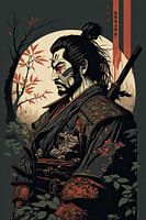 De afbeelding toont een samoerai in vol ornaat, staande met zijn zwaard klaar voor de strijd. De samoerai heeft zijn harnas aangetrokken. Zijn harnas is uitgebreid en gedetailleerd en weerspiegelt zijn klasse en rang in de Japanse samenleving.